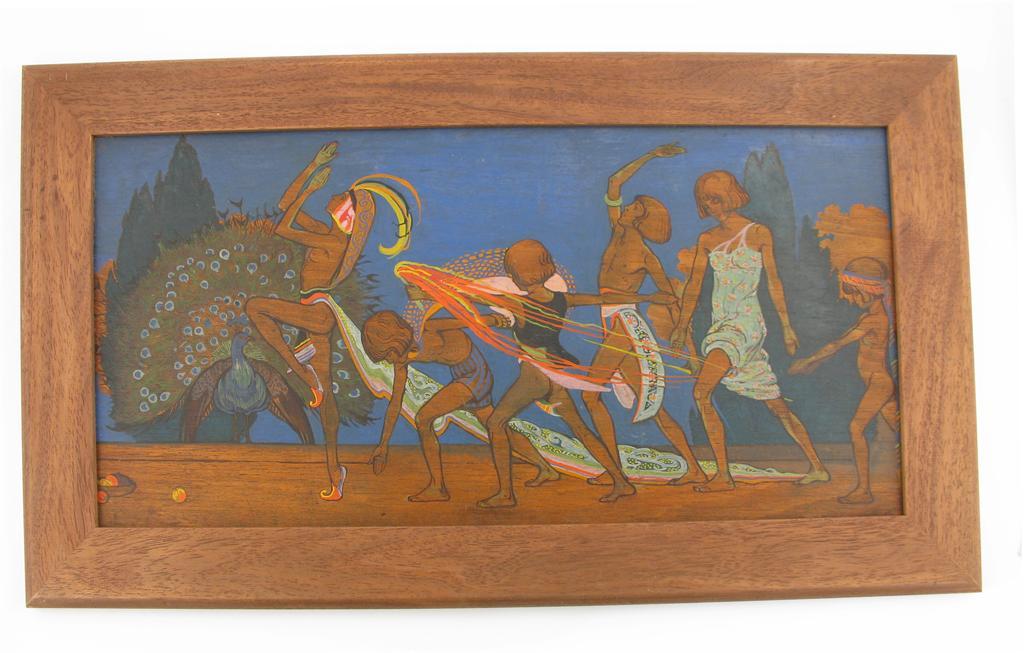 An English painted wood panel rectangular depicting a frieze of dancing figures before a peacock...