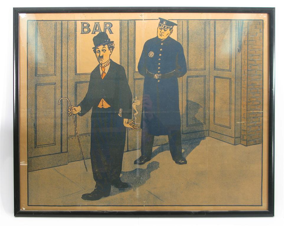 A lithographic poster of Charlie Chaplin, framed unsigned image 73 x 57cm.