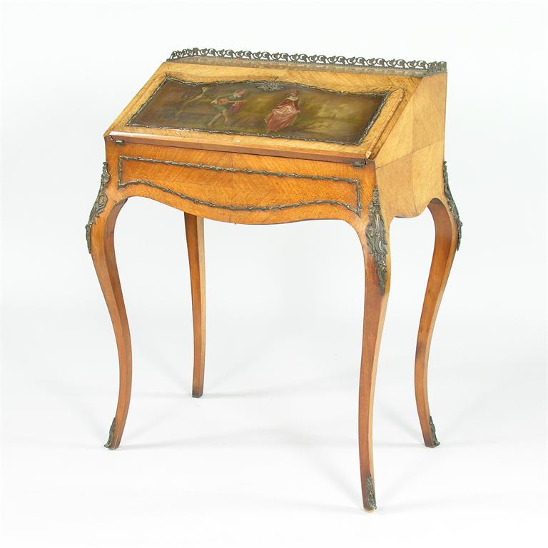 A French rosewood bonheur-du-jour, with brass mounts, the serpentine top fall with a painted panel depicting a romantic scene to a well, pigeon holes and drawers, on slender cabriole legs, 36.25in (92cm) h, 29.25in (74.3cm) w, 18in (46cm) d.