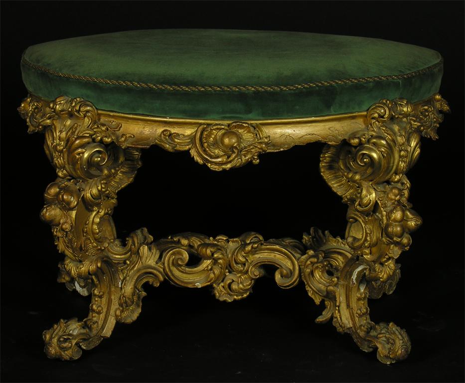 A French carved giltwood and gesso stool, the shaped padded top, on scroll, fruit and foliage base, 18in (45.6cm) h, 28in (71cm) w, 19in (48.3cm) d. Back frieze missing.