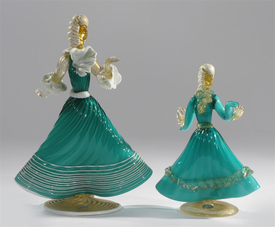 A pair of Murano glass figures each modelled in elaborate green costume, with applied white glass detailing, clear glass features with aventurine inclusions applied paper labels, tallest 25 cm. high