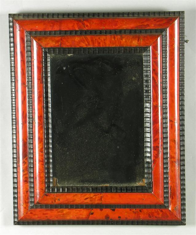 A late 19th century Dutch tortoiseshell cushion frame and ebonised ripple moulded wall mirror, with a rectangular bevelled plate, 21.5 x 17.5in (54.5 x 44.4cm).