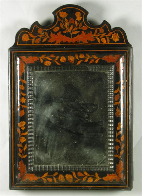 A 19th century Dutch ebony and floral marquetry inlaid wall mirror, the shaped cresting to a moulded frame with ripple border and later plate, 33 x 22in (83.8 x 55.8cm). The cresting is loose, formerlly from a dressing table.