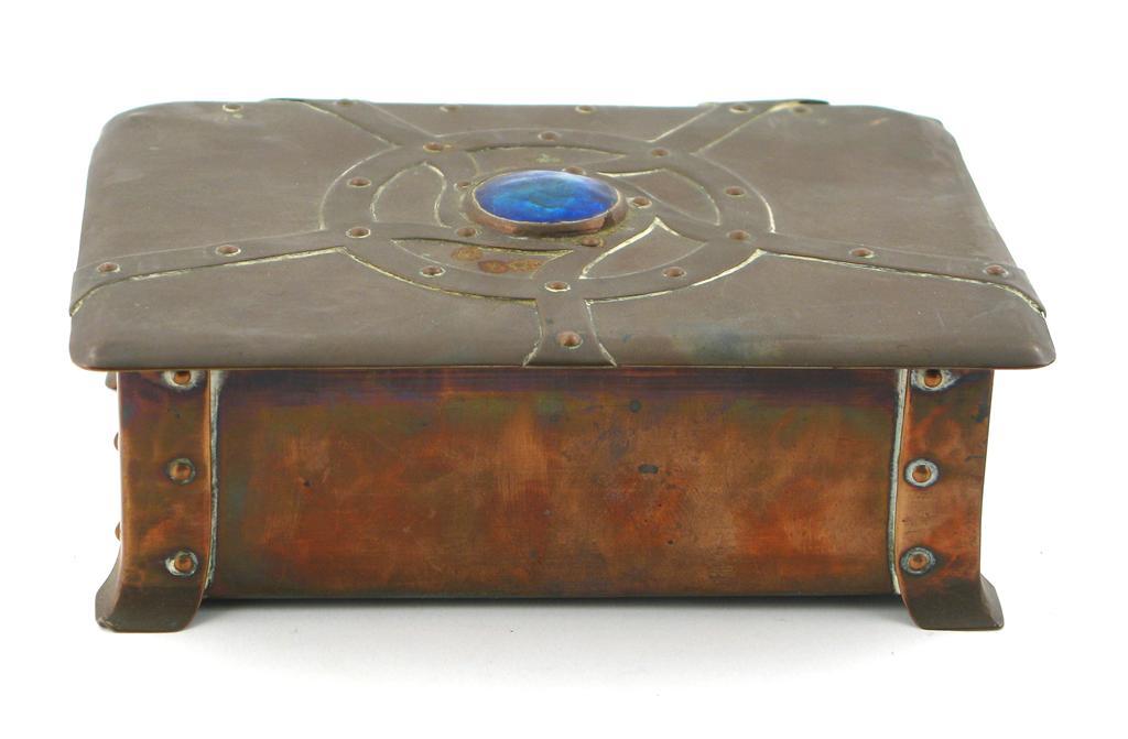An Arts and Crafts copper and enamel cigarette box rectangular with hinged cover