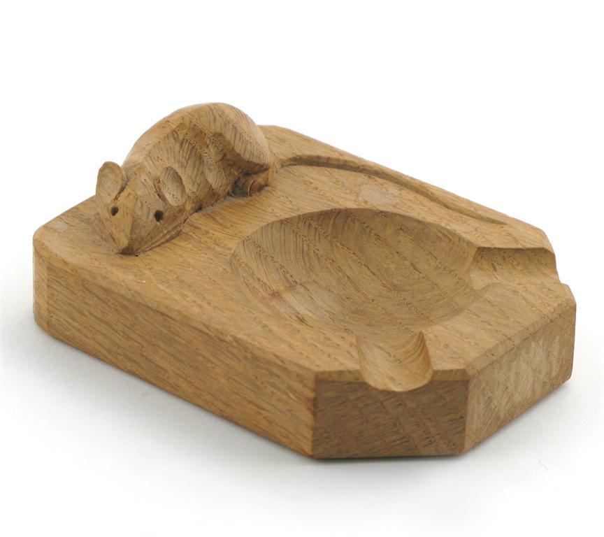 A Robert Mouseman Thompson oak ashtray with carved mouse signature 10.5cm. long