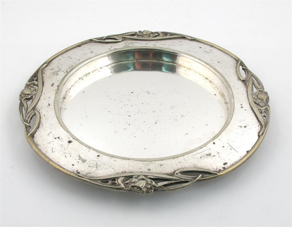 A William Hutton & Son Art Nouveau electroplated tray the rim cast with pierced foliate panels