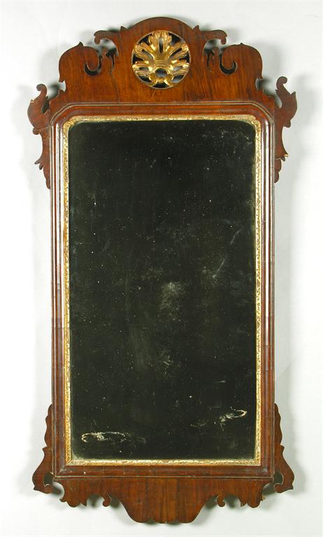 A 19th century walnut and parcel gilt fret frame mirror, the rectangular plate to cusp corners and a shell surmount, 39.75 x 21in (101 x 53.3cm).