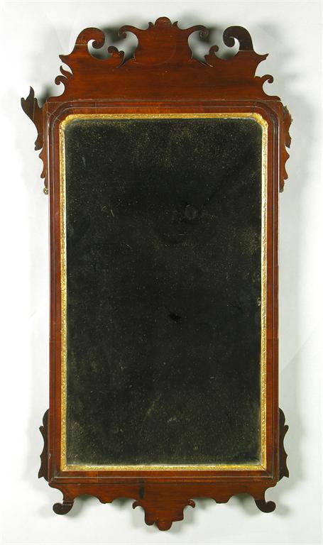 A mahogany fret frame wall mirror, the rectangular plate within a moulded and parcel gilt frame, to shaped surmount and base, late 19th century, 40.75 x 21.5in (103.5 x 54.5cm). Losses and replacements.