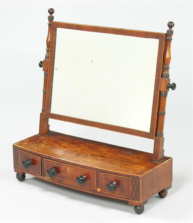 A George IV mahogany dressing table mirror, the rectangular plate on ebonised ring turned supports to a bowfront base with three drawers and diaper inlaid panels, on ball feet, 24.5in (62cm) h, 22.5in (57cm) w, 10in (25.4cm) d.