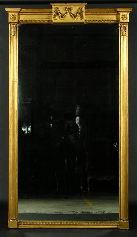 A late Victorian giltwood and gesso pier mirror, the reeded cornice with a central tablet, applied ribbon tied drapes above a rectangular plate flanked by rosette headed fluted pilasters with leaf capitals, 66.75 x 38in (169.5 x 96.5cm).