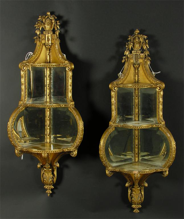 A pair of late 19th century giltwood and gesso hanging corner brackets, with husk and foliage decoration and bevelled mirror plates, 51in (129.5cm) h, 20in (50.8cm) w, 12in (30.5in) d. (2)