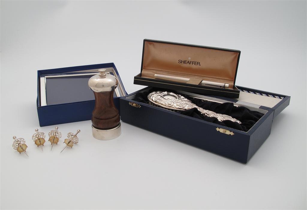 A mixed lot of modern silver items, various dates and makers, comprising: a photograph frame, a silver-mounted wooden pepper mill, a hair brush and comb, a pen and four sweetcorn holders, all cased or boxed. (5)