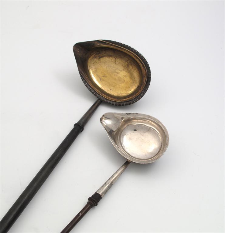 A George III silver toddy ladle, by Thomas Shepherd, London 1779, oval form, wooden baluster handle, plus another toddy ladle. (2)