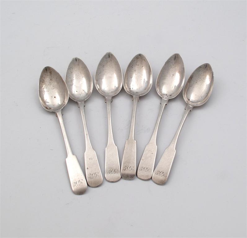 A set of six early 19th century Scottish provincial silver Fiddle pattern teaspoons