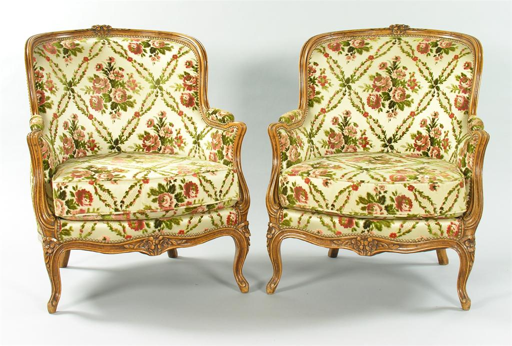 A pair of French carved and moulded show frame easy armchairs, the wrap around backs with a floral cresting to padded arms, serpentine front seats on cabriole legs. (2)
