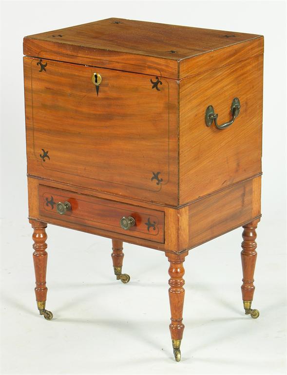 An early 19th century mahogany cellaret, inlaid ebonised stringing and fleur-de-lys motifs, the hinged top to part divided interior, brass side handles, the base with a drawer on ring turned legs to brass castors, 24.75in (63cm) h, 15.75in 940cm) w, 12in (30.5cm) d.