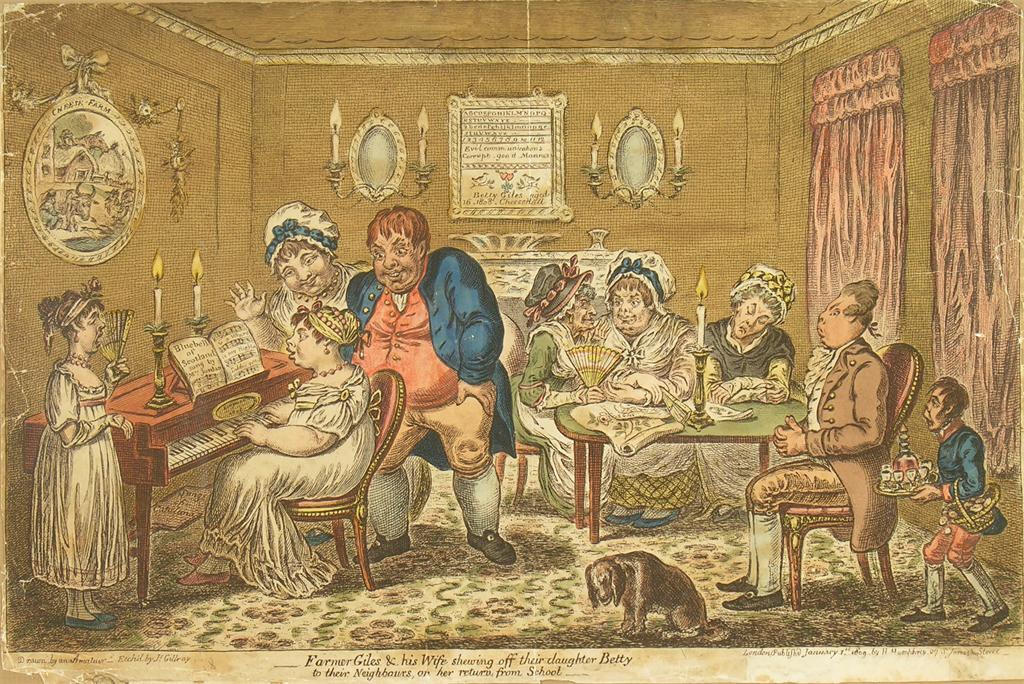 After James Gillray. 'Farmer Giles & his Wife shewing off their daughter Betty to their Neighbours