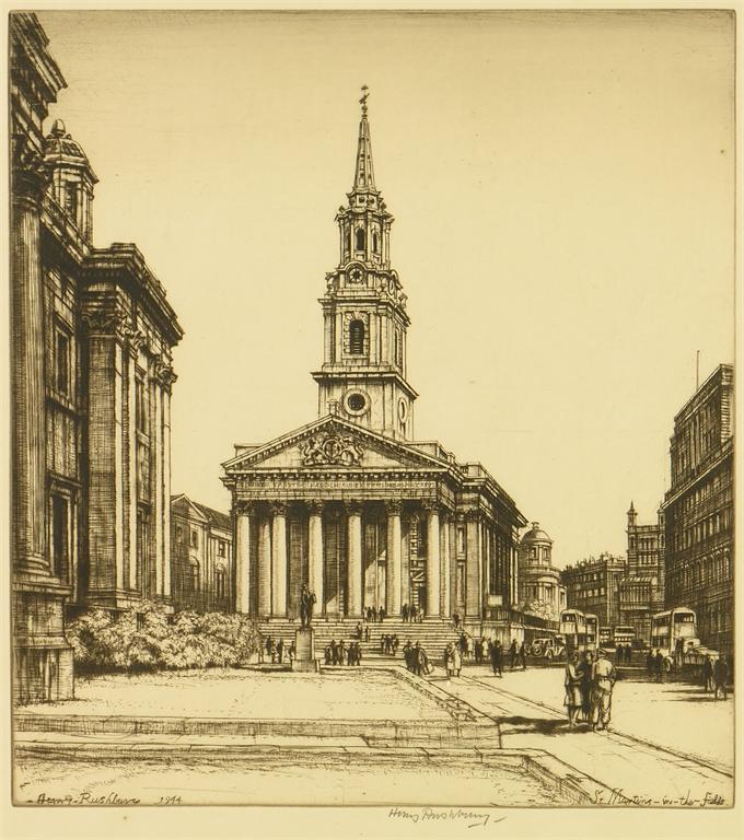 A dry point etching of Horse Guards Parade, Whitehall, 1947, by Henry Rushberry RA, and four other Rushberry etchings. (5)