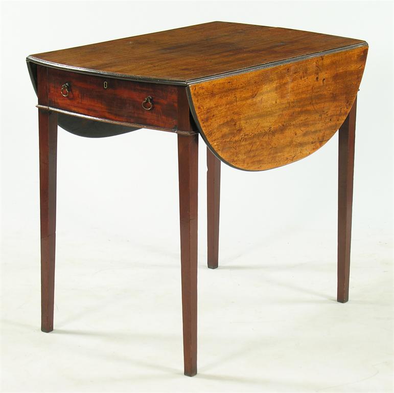 An early 19th century mahogany Pembroke table, the moulded edge oblong top above a whole frieze drawer with cedar divisions, later brass handles, on square tapering legs, 28in (71cm) h, 20.25in (51.4cm) w, closed, 31.75in (80.6cm) d.