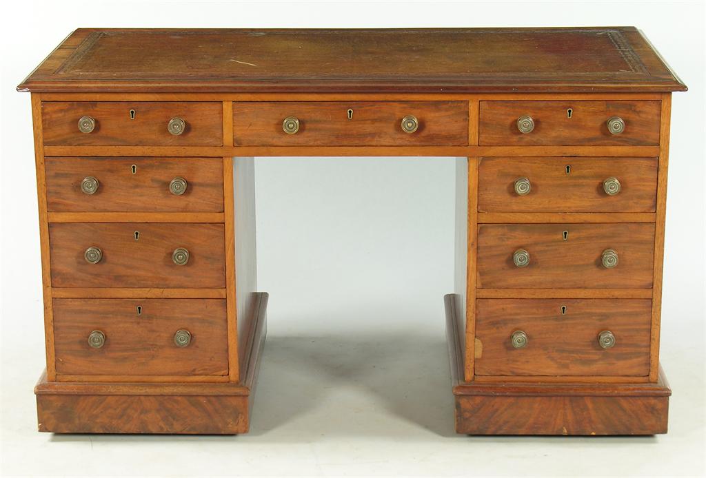 A Victorian mahogany pedestal desk, the gilt tooled leather inset top with a moulded edge above three frieze drawers and three drawers each side fitted later brass handles, the plinth base on ceramic castors, 29.75in (75.5cm) h, 51.25in (130.2cm) w, 25.75in (65.4cm) d.