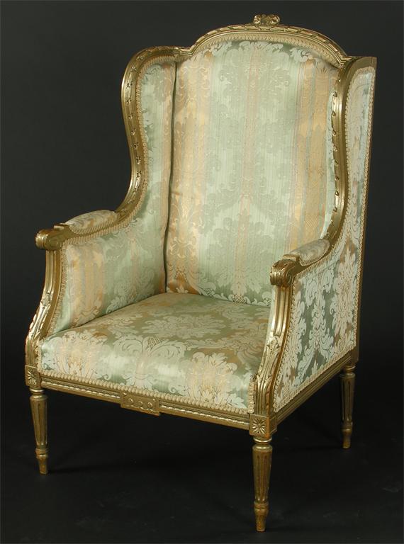 A French carved wood and silvered wing armchair, having cable borders and a floral cresting to padded arms, on turned fluted legs.