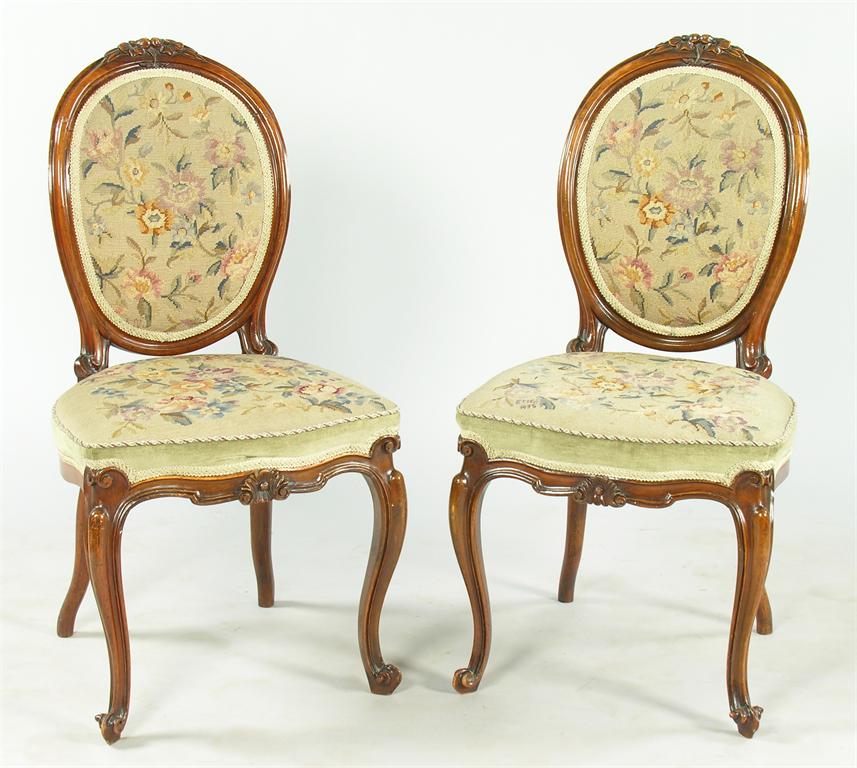 A pair of 19th century walnut salon chairs, with needlework upholstery, the oval backs with floral carved crestings, the serpentine front seats on moulded cabriole legs to scroll toes. (2) One leg with old worm and repairs to backs.