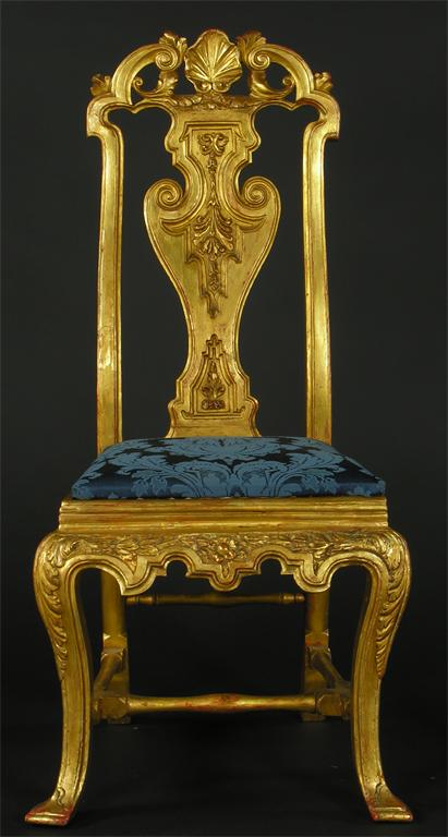 A carved giltwood side chair, in early 18th century style, the open curved back with a shell crest above a vase shape splat, the drop-in seat to a shaped apron on square cabriole legs.