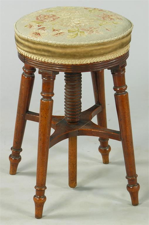 A Regency adjustable music stool, the circular needlework seat on a screw to a mahogany reeded frame with turned tapering legs united by an 'X' stretcher, 20in (50.8cm) h, down, 12.75in (32.4cm) dia.