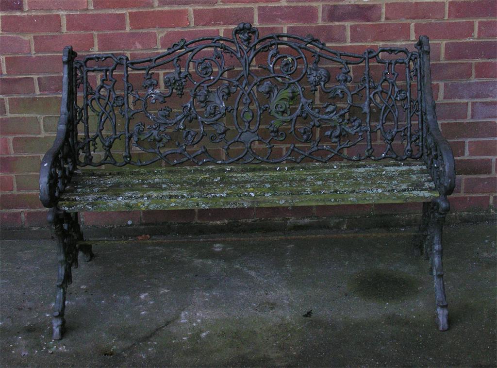 A painted cast iron garden bench, with a slatted seat, 34in (86.3cm) h, 49.5in (125.6cm) w, 24in (61cm) d.