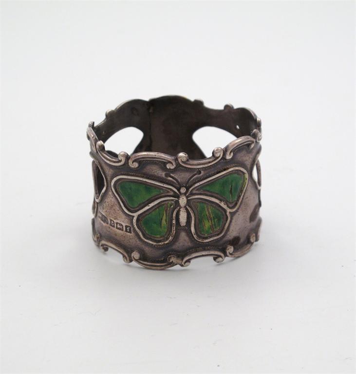 An Edwardian silver and enamel napkin ring, by William Sparrow, Birmingham 1905, circular form, pierced with two butterflies and enamelled with a green butterfly, diameter 4.5cm.