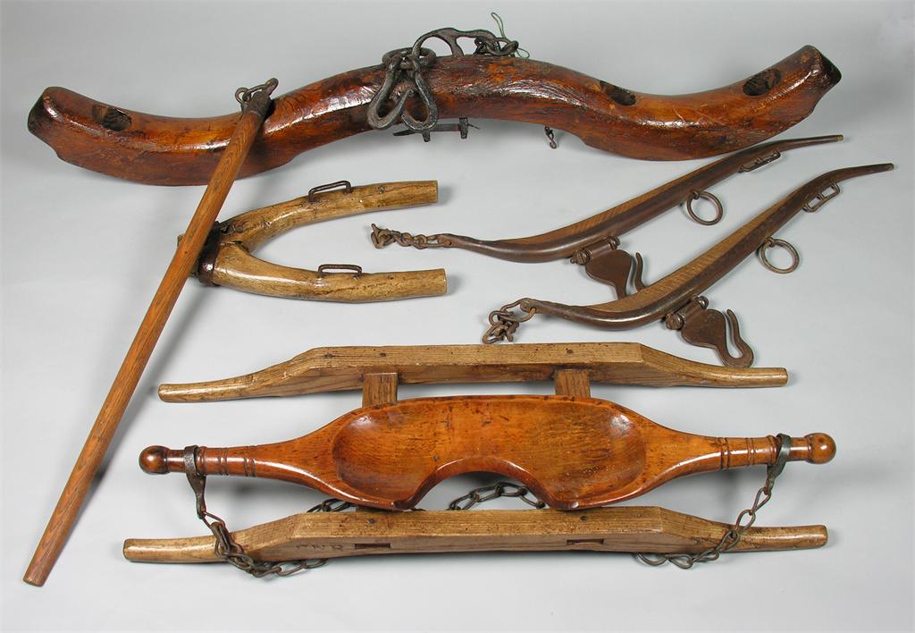 An elm Ox yoke, with iron hooks, 54in (137cm) l., a pair of harnesses, a fruitwood milk or water carrier's yoke, an ash Railways porters rack, branded 'GNR,' 36.25in (92cm) l., and two other pieces.