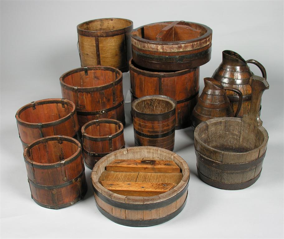A Victorian bentwood measure, iron bound and branded 'VR' crowned '346' and 'BECK', 8in (20.3cm) h, a turned pot with an ebonised central band, two presses with pierced bases, two jugs, a piggin and a graduated set of five pots.