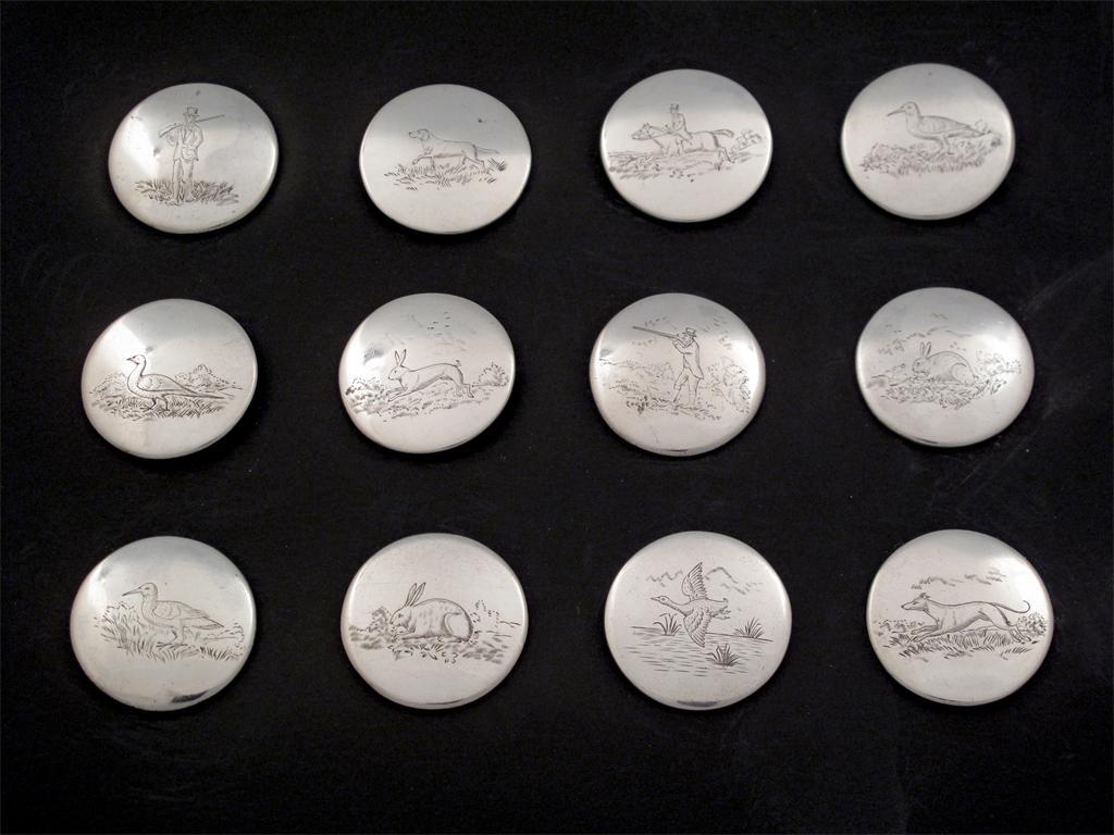 A set of twelve George III silver hunting buttons, maker's mark only, that of William Seaman, London circa 1810, circular form, engraved with scenes of huntsmen on horse and foot and various game, diameter 2.5cm, approx. weight 3oz. (12)