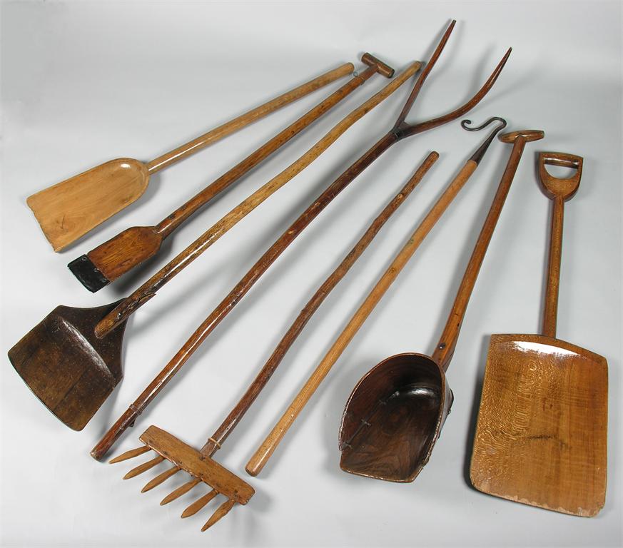 A beech malt shovel, 41in (104cm) l., a grain shovel, branded 'D.V.', a six prong rack, a hay fork branded 'Y.R.C.', a shovel with an angled handle, a mud scuppit, a fruitwood flat shovel and a shepherd's crook.
