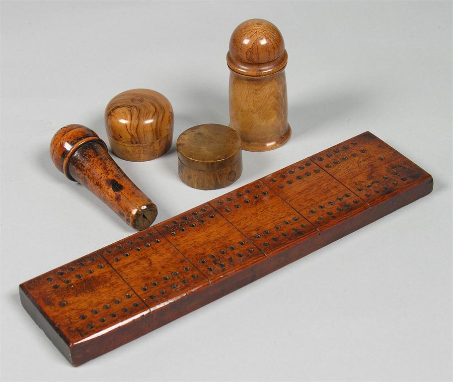 A cribbage board, 13.25in (33.6cm) l., five stained and natural ivory markers in a tapering cylindrical pot with screw cover, an olivewood pot containing a glass jar and two other turned pots.