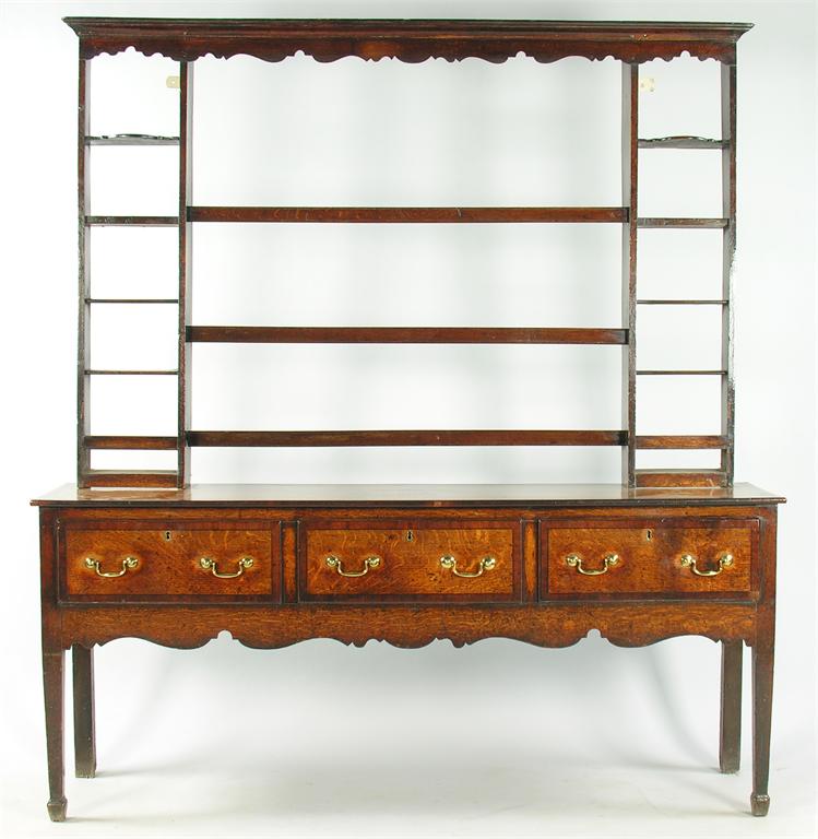 A George III oak and mahogany banded dresser, the associated plate rack with a shaped frieze, the base with three drawers fitted brass swan neck handles, above a shaped apron on square tapering legs to spade feet, 80in (203.2cm) h, 73.25in (186cm) w, 17.5in (44.4cm) d.