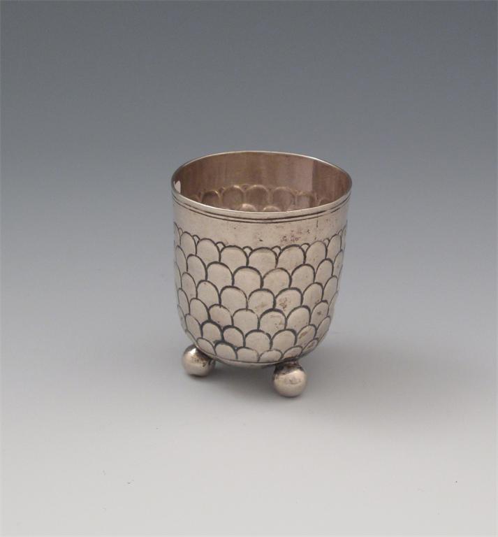 A late 18th century German silver beaker, by Johann Friedrich Ehe, Nurenberg circa 1780, circular form, with feather decoration, on three ball feet, height 5.8cm, approx. weight 1.9oz.