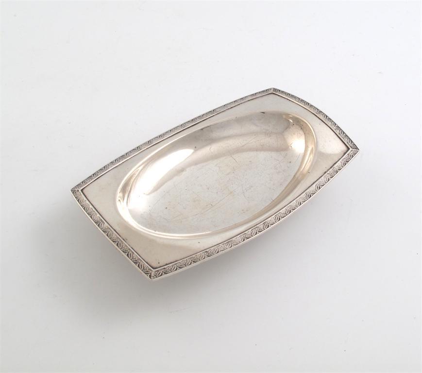 By Tiffany and Co, an American silver dish, shaped rectangular form, stylised border, on an oval foot, length 17.5cm, approx. weight 6oz.