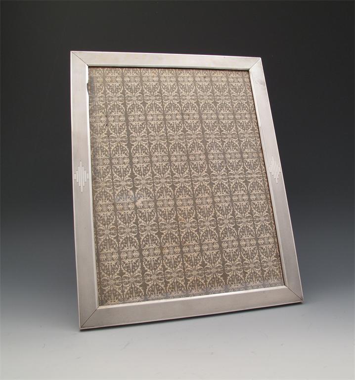 A continental silver mounted photograph frame, rectangular form, engine turned decoration, wooden easel back, height 39cm.