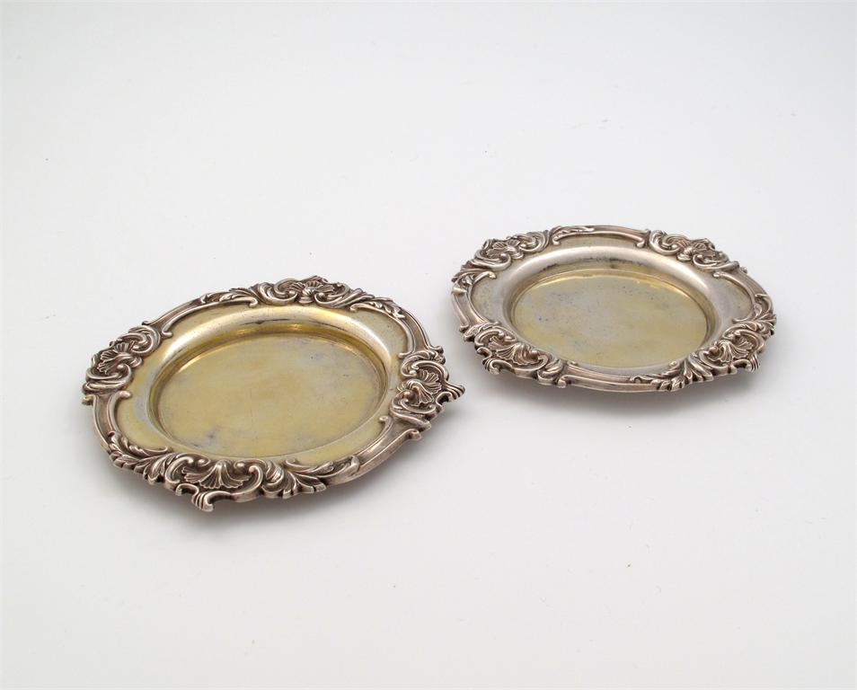A pair of Victorian silver salt dishes, by John Watson and Son, Sheffield 1838, circular form, foliate scroll border, gilded bowls, diameter 12.4cm, approx. weight 7oz. (2)