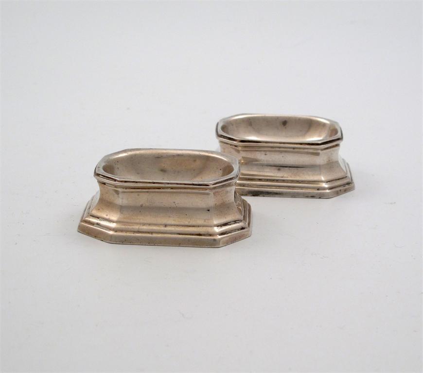 A pair of silver trencher salts, by Thomas Bradbury and Son, Sheffield 1918/19, plain rectangular form, canted corners, length 6.5cm, approx. weight 5oz. (2)