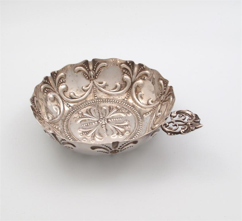 A late-Victorian silver dish, by George Lambert, London 1896, circular form, embossed foliate decoration, with a pierced side handle, (one handle missing), diameter 5.4cm, approx. weight 7oz.