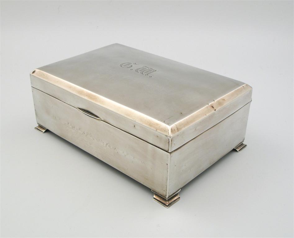 A silver cigar box, by Charles Green and Co, Birmingham 1918, rectangular form, the hinged cover engraved with initials, on four bracket feet, length 23.5cm.