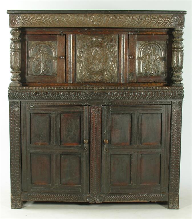 A carved oak court cupboard, the floral and leaf decorated canopy above a pair of cupboard doors, on leaf decorated supports, a divided shelved base enclosed by a pair of panel doors, panelled sides constructed with 17th century elements, 65in (165cm) h, 57.25in (145.4cm) w, 23in (58.4cm) d.