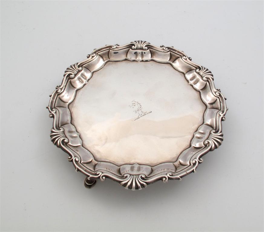 A George II silver waiter, by Hugh Mills, London 1749, circular form, shell and scroll border, the centre crested, on three hoof feet, diameter 17.8cm, approx. weight 7oz.