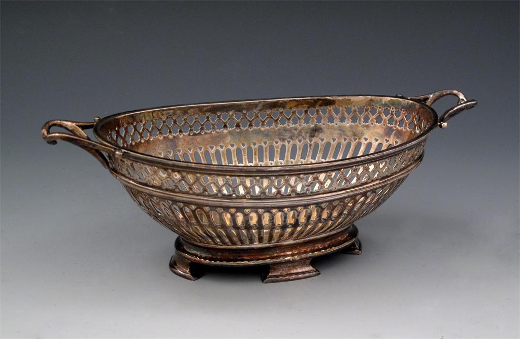 A Scottish silver basket, by R and W Sorley, Glasgow 1914, oval form, pierced with slats, and with scroll handles, on four bracket feet, length 20.8cm, approx. weight 8oz.