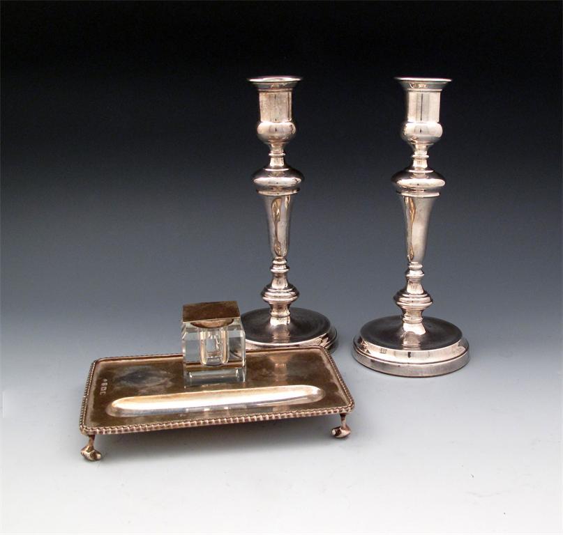 tapering circular form, on circular bases, height 22.2cm, plus a silver inkstand, by The Adie Brothers, Birmingham 1935, rectangular form, gadroon border, inscribed, with a silver mounted glass inkwell, mount loose, approx. weighable 7oz. (3)