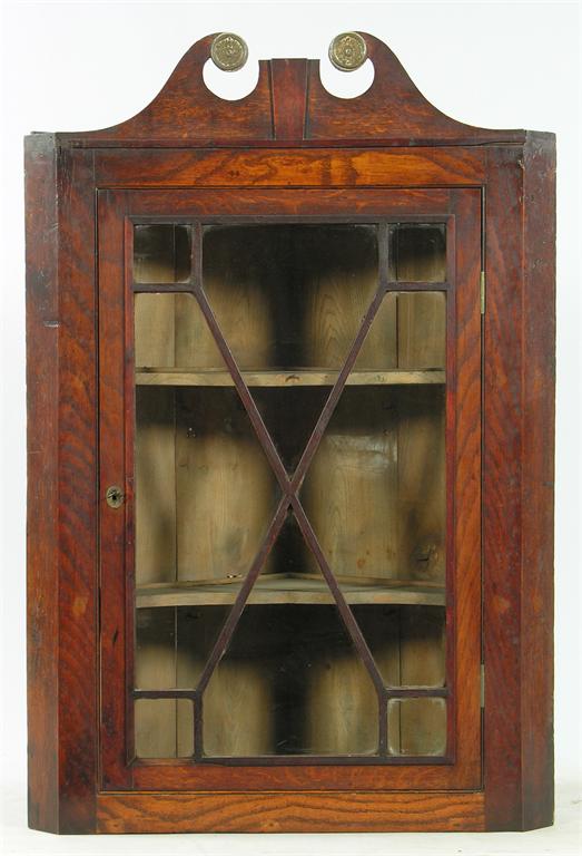 A 19th century oak hanging corner cupboard, the swan neck pediment with embossed brass bosses to a mahogany tablet, above shaped shelves, enclosed by a glazed door with mahogany astragals, 43.75in (111cm) h, 29.25in (74.3cm) w, 15.75in (40cm) d.