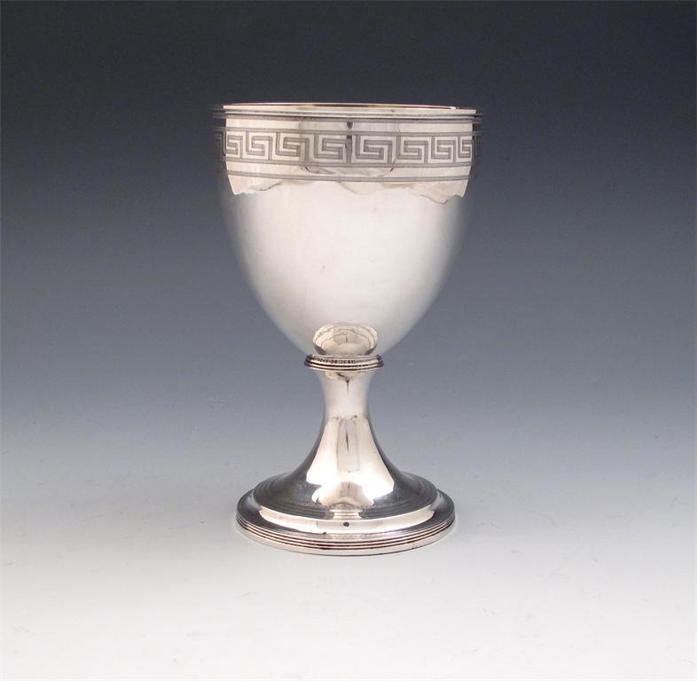 urn form, Greek key border, on a raised circular foot, inscribed 'Presented to Captain Alexander Hay by the non commissioned officers and Privates of his Company of Nairnshire Volunteers as a mark of their respect for him', height 16.3cm, approx. weight 5oz.