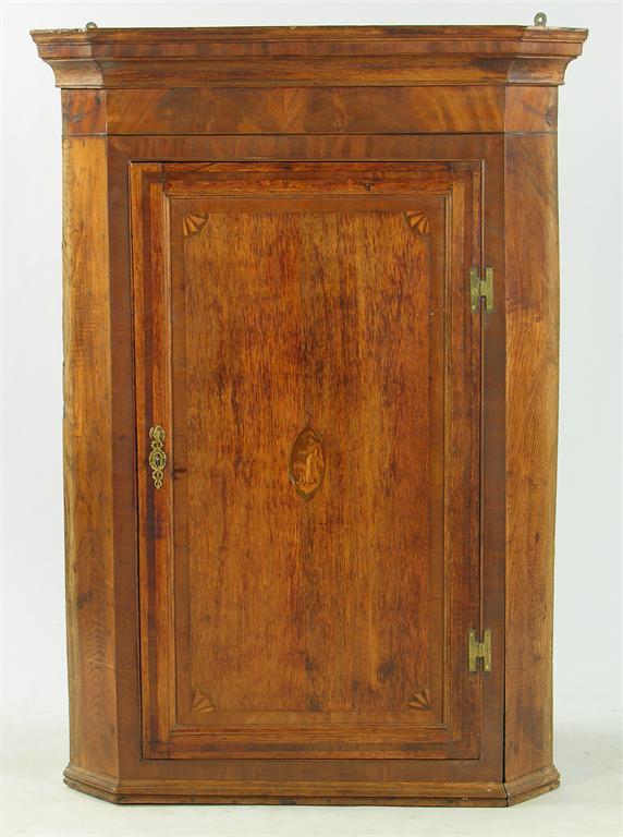 An early 19th century oak and mahogany banded hanging corner cupboard, the moulded cornice above a strung frieze to shaped shelves enclosed by a panel door with marquetry inlay, centred Britannia, 45in (114.3cm) h, 32in (81.3cm) h, 16.75in (42.5cm) d.